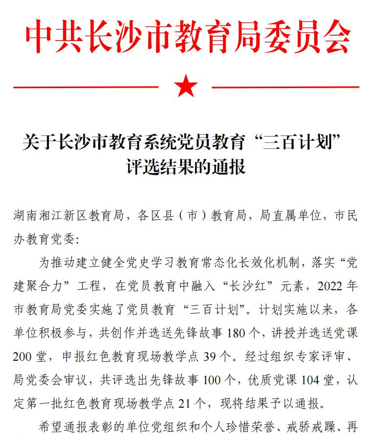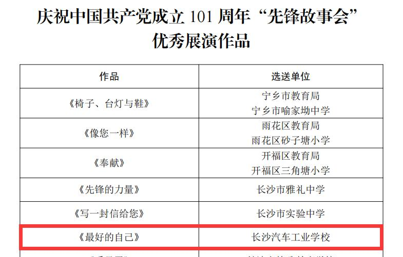 为落实“党建聚合力”工程,在党员教育中融入“长沙红”元素,2022年市教育局党委组织了党员教育“三百计划”遴选活动。经过层层遴选,我校原创校园剧《的自己》入选庆祝中国共产党成立101周年“先锋故事会”优秀展演作品。学校党委将珍惜荣誉,继续组织力量精心打磨更多优秀展演作品,为打造“品质教育”新品牌贡献长汽力量。