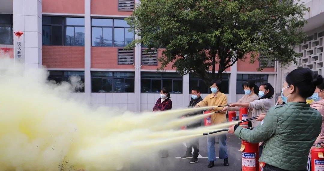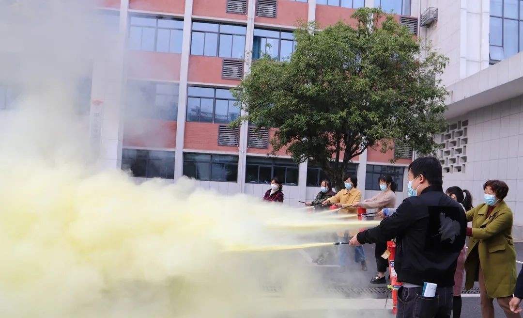 “一提、二拔、三瞄、四压,这是最基本的灭火器的使用方法,但在使用时需注意灭火时需要保持一米五的距离,不可以站在风口处灭火,不然灭火器里的干粉容易误伤到自己。”讲座后,徐建国带领各位教职工来到一教前坪进行了灭火器实战演练。受邀的老师们均能按步骤正确使用灭火器,快速成功灭火。理论加上实践,让每位教职工系统掌握操作要领和注意事项,提升火灾事故的应急处理能力。