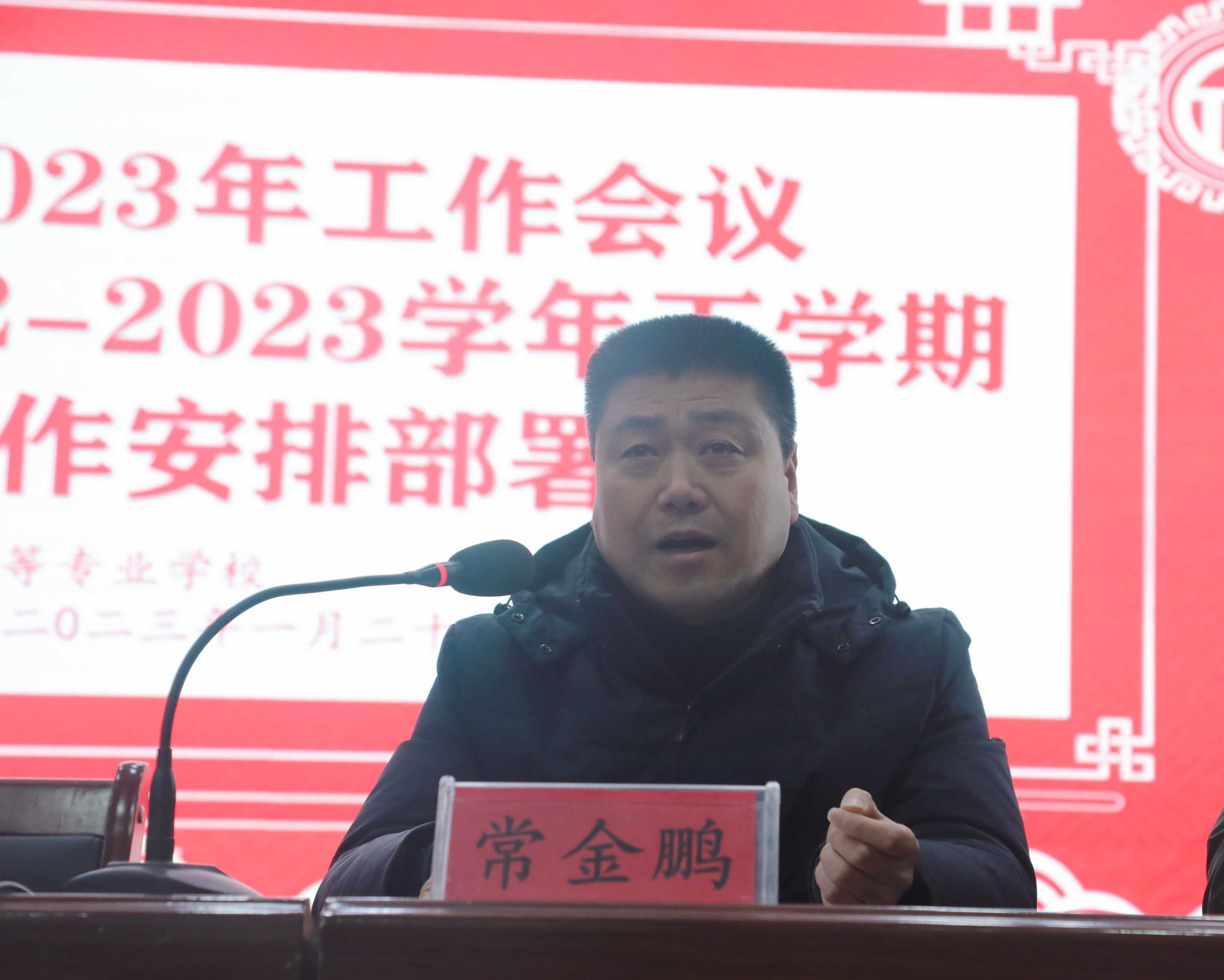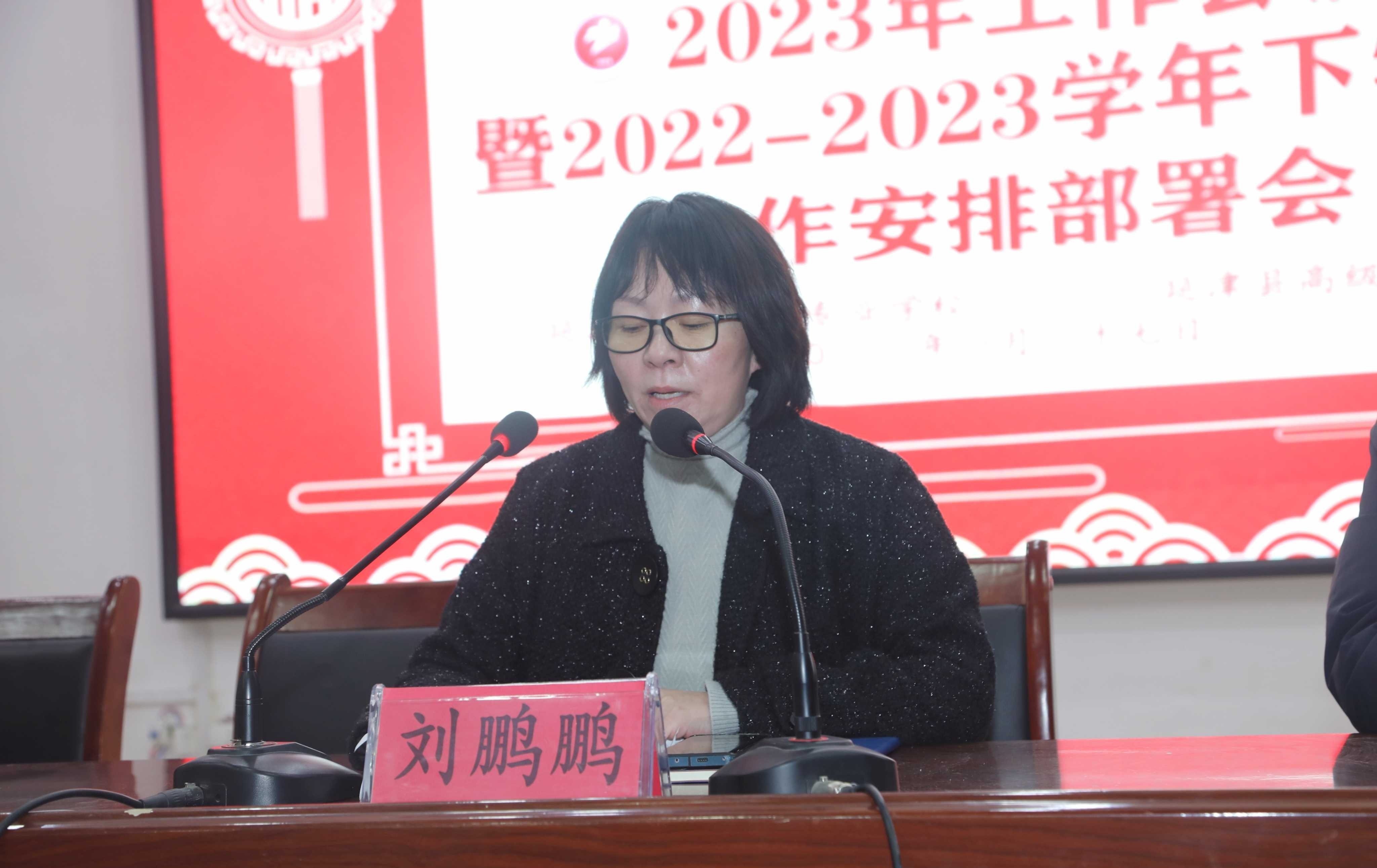 会上,校党总支书记刘鹏鹏作重要讲话。她首先对学校2022年重点工作进行回顾,对学校取得的荣誉、办学条件改善提升、教育教学改革及招生等工作取得的成绩给予充分肯定;分析了学校发展过程中存在的具体问题,也对2023年工作进行了全面安排部署。她指出,站在新起点,学校要在进一步提升基层党建工作的基础上,对标学校2023年度重点任务和中心工作,要全力做好专业设置规划,科学谋划招生工作,加快推进基础设施建设,加强师资队伍建设,落实新校区建设任务,改革教学及学生管理工作,狠抓治理能力提升,加强校园安全稳定工作,积极深化内涵建设,推进产教融合、校企合作,擦亮更多职教品牌,努力朝着建设管理规范、特色明显的目标迈进。要全面落实立德树人根本任务,持续深化自我教育提升活动,扎实开展“四史”学习,实际开展丰富多彩的学习教育活动,引导广大教师争做“四有”好老师。