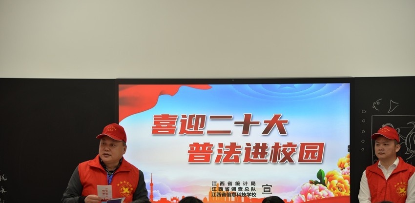 2022年10月20日正值党的二十大召开之际,为落实普法宣传教育,助力法治校园平安建设,引导青少年树立尊法学法守法用法意识,江西省统计局、江西省调查总队和我校志愿者一起开展了“喜迎二十大、普法进校园”的课堂法制宣传活动。